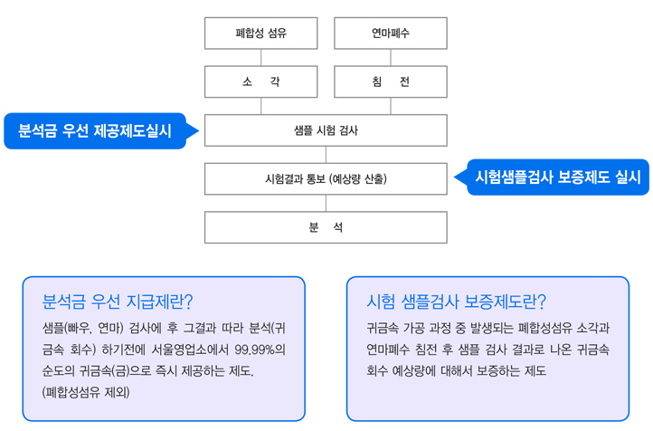 특히 분석과정을 투명하게 공개하고, 기술연구소의 분석전 샘플검사를 통하여 생산량을 예측하여 고객과의 상호 신용과 신뢰를 확보하는 프로그램을 실시하고 있습니다. 또한 고객과의 밀접한 상담을 통하여 분석전에 서울영업소를 통하여 KS 규격의 99.99%의 금을 미리 지급 받으실 수 있는 제도를 마련하여 분석후까지 기다릴 필요가 없도록 최대한 편의를 제공하여 하고 있습니다.